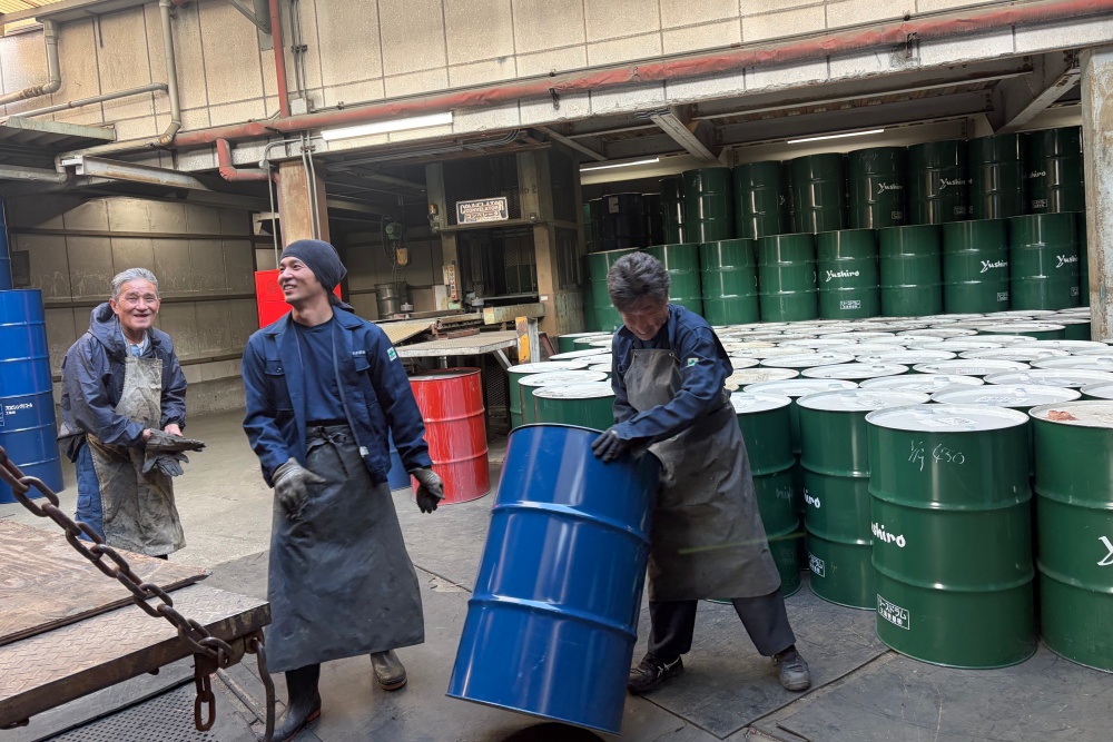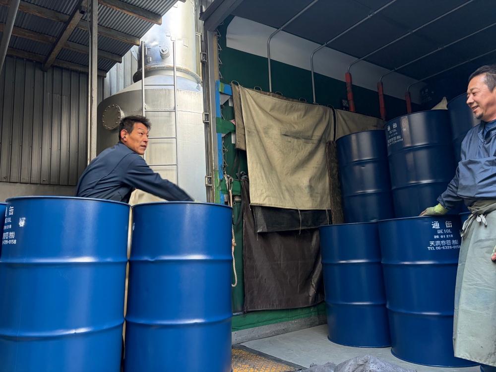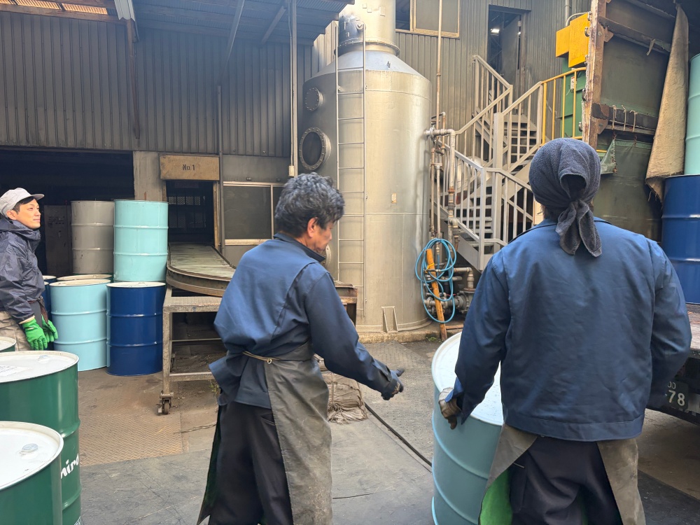 空ドラム缶は力ではなく、体の使い方で作業します。